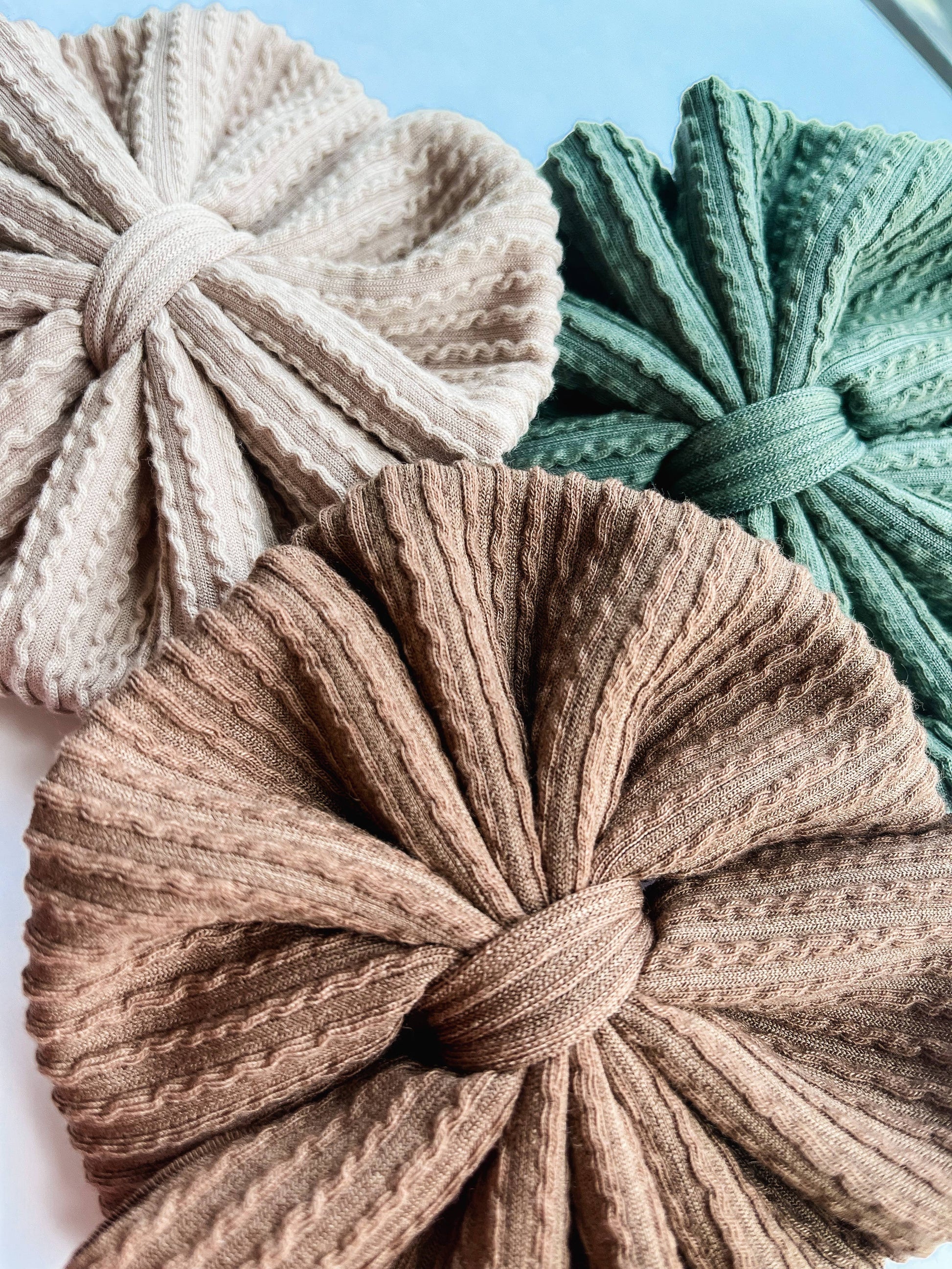 Our neutral messy baby bow headbands are ideal for newborn - 24 months. They are made in the USA from an incredibly soft fabric. Placed on a nylon headband.
