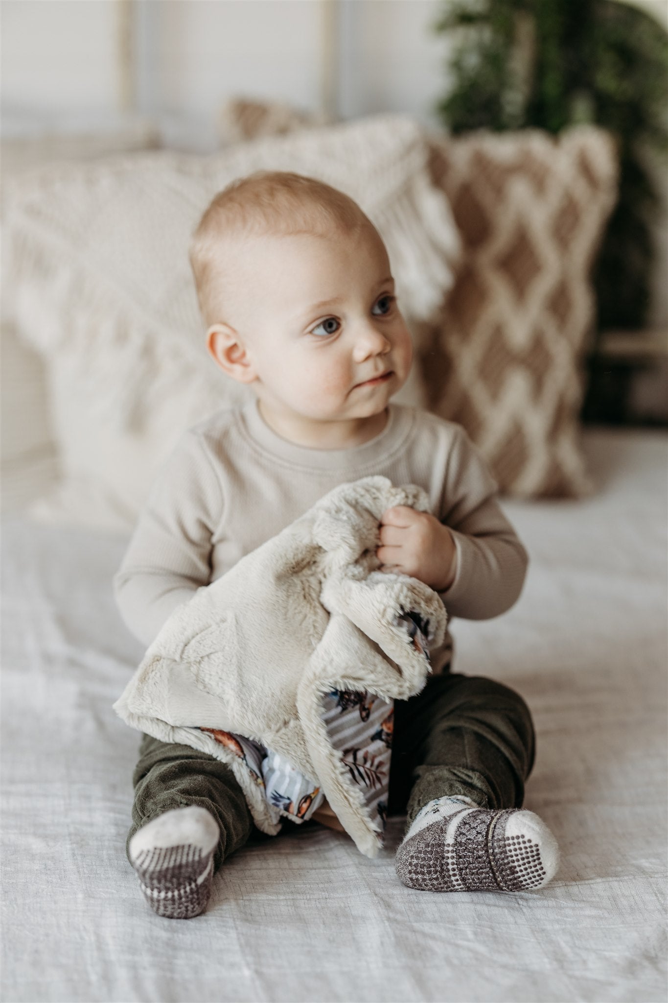 A lovey is a small, soft blanket made from plush minky material, providing comfort and security to young children. Ideal for snuggling, loveys are great for soothing. Lightweight and easy to carry, they’re perfect for warm weather and travel, making them a comforting companion in car seats, strollers, at daycare, or grandma’s house.